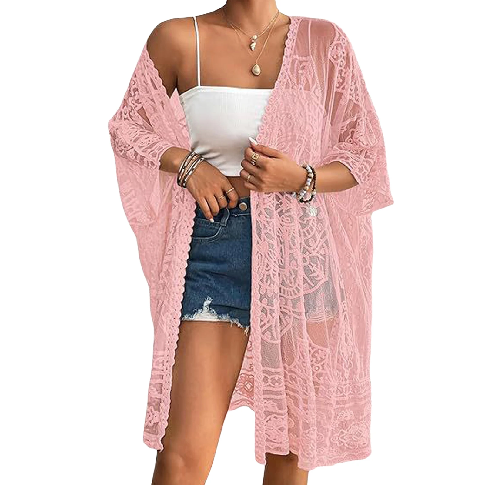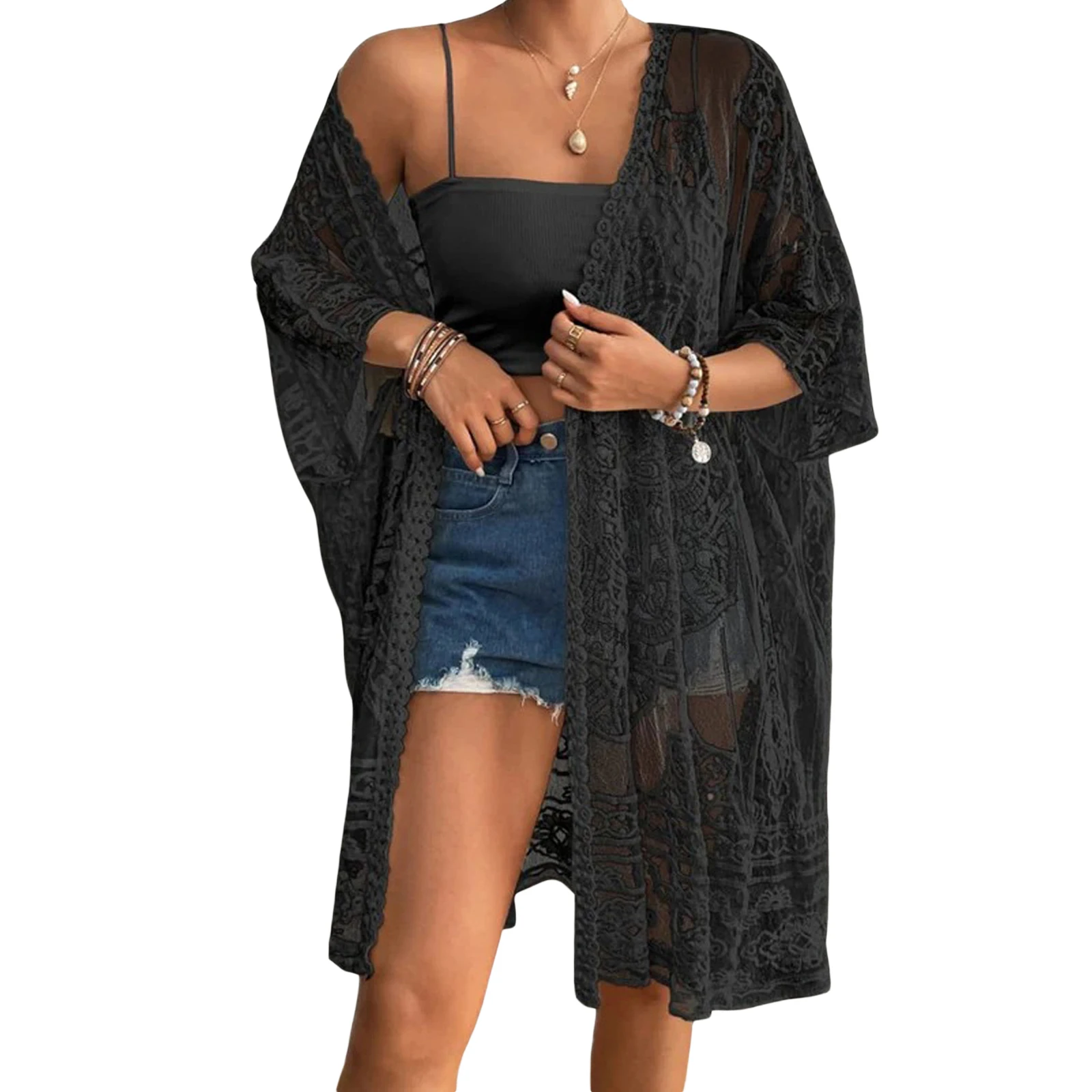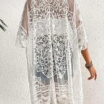 Women’s Lace Bikini Cover-Up 3/4 Sleeves Open Front Sheer Mesh Crochet Kimono Cardigan